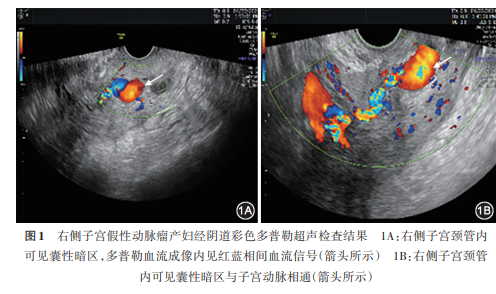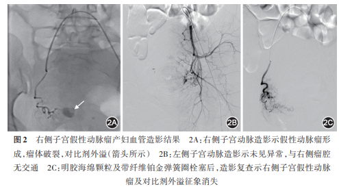 1南通大学附属江阴医院产科,江阴 214400;2南通大学附属江阴医院超声科,江阴 214400;3南通大学附属江阴医院介入科,江阴 214400通信作者:薛勤, Email: 1770491937@qq.com引用本文:蒋美琴,薛勤,孟文静,等. 阴道分娩后子宫假性动脉瘤致晚期产后出血1例[J]. 中华妇产科杂志,2025,60(02):146-148.DOI:10.3760/cma.j.cn112141-20240714-00393子宫假性动脉瘤(UAP)是一种血管损伤并发症,临床罕见,尤其是发生于阴道分娩后。该病一旦发生,可能危及生命,因此,早期诊断是临床进行及时有效处理的关键。本文回顾性分析1例于南通大学附属江阴医院阴道分娩后UAP导致晚期产后出血产妇的临床资料,该例产妇经多学科团队诊治获得良好结局。通过本例产妇的诊治经过并结合相关文献复习,以期提高产科及影像科医师对UAP的认知及诊治水平。产妇34岁,孕1产1,因“阴道分娩后11 d,突发多量阴道流血3 h”于2024年4月20日16:45就诊于本院。2024年4月7日因“妊娠期糖尿病,孕41 +5周”外院就诊,入院第2天8:30因“妊娠延期”行“人工破膜”引产,第3天1:30宫口开全,胎心率168次/min,基线变异正常,羊水清,黏稠状;体温38.4 ℃,心率122次/min,血压125/80 mmHg(1 mmHg=0.133 kPa),无呼吸道症状,宫体疼痛感加剧;血常规检查显示白细胞计数12.72×10 9/L,中性粒细胞比例89%,超敏C反应蛋白88.2 mg/L;予头孢西丁抗感染治疗,对乙酰氨基酚退热治疗后体温下降至37.8 ℃;1:57因胎心率持续高于160次/min,行会阴侧切助产分娩一男婴,新生儿出生体重3 800 g,1分钟、5分钟Apgar评分均为10分,产程顺利,胎盘胎膜自然娩出完整,胎盘送病理检查,产时出血380 ml。产后体温正常,予抗感染治疗3 d出院,胎盘常规病理诊断:急性绒毛膜羊膜炎。产妇行母乳喂养,恶露量少,色暗红。产妇于本次就诊3 h前突发下腹痛后大量阴道流血,色鲜红,多于月经量。体格检查:心率118次/min,血压102/80 mmHg,腹平软,无压痛及反跳痛,宫底脐耻之间,质硬,无压痛。产科检查:阴道内见少量暗红色血液,子宫颈光,外口松,子宫前位,增大如孕3月余大小,无压痛;双侧附件无异常。拟诊“晚期产后出血,子宫复旧不良”收入院。行急诊超声检查(经腹)提示:子宫颈管内混合回声结构(积血可能)。入院后查肝肾功能正常,人绒毛膜促性腺激素(β-human chorionic gonadotropin,β-hCG)5.6 U/L,血红蛋白水平99 g/L;予缩宫、止血、抗炎治疗,产妇出血量变少,病情稳定;2024年4月22日17:00又一次突发阴道大量流血,出血量约1 280 ml;休克指数(shock index,SI;为心率与收缩压的比值)为1.56;立即予输血、抗休克治疗,同时行经阴道彩色多普勒超声检查提示:右侧子宫颈管内见2.0 cm×1.7 cm的液性暗区,边界清,多普勒血流成像内见红蓝相间血流信号,右侧子宫动脉与该囊性暗区见分流口( 图1 )。超声诊断:偏右侧子宫颈管内囊性暗区[子宫假性动脉瘤(uterine artery pseudoaneurysms,UAP)可能],予麦角新碱0.2 mg缩宫治疗,并予阴道前后穹隆填塞纱布后出血稍缓解;同时行急诊盆腔血管造影,提示右侧子宫动脉末梢见类圆形造影剂外溢( 图2A ),诊断为右侧UAP,予明胶海绵颗粒及带纤维铂金弹簧圈栓塞,栓塞后造影复查假性动脉瘤征象消失( 图2B );左侧子宫动脉造影未见造影剂外溢,予明胶海绵栓塞后造影,与瘤腔无交通( 图2C )。手术疗效显著,产妇术后无阴道流血;术后3 d复查彩色多普勒超声示:假性动脉瘤瘤腔消失;恢复良好,于动脉栓塞后4 d出院;目前随访中。