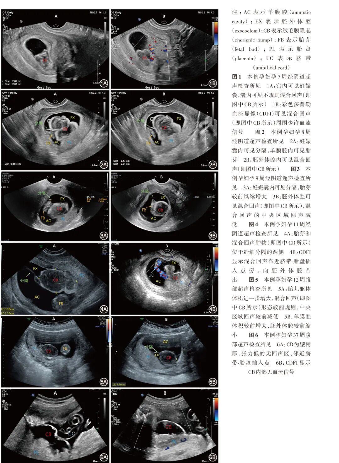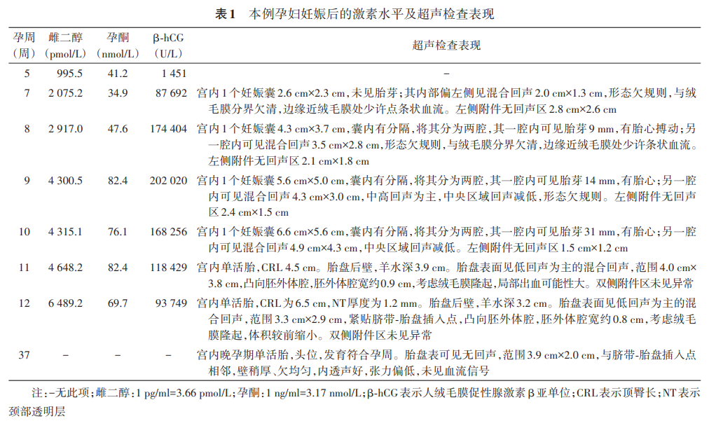 北京 100730;2中国医学科学院北京协和医学院 北京协和医院超声医学科,北京 100730通信作者:张一休, Email:yixiu241@163.com引用本文:张多多,黄姝伦,张一休. 体外受精-胚胎移植后妊娠并发绒毛膜隆起1例[J]. 中华妇产科杂志,2025,60(03):221-224.DOI:10.3760/cma.j.cn112141-20240918-00509早孕期绒毛膜隆起临床罕见,易误诊漏诊。本文报道1例辅助生殖治疗后妊娠的绒毛膜隆起孕妇,其于孕7周起超声检查发现宫腔内不规则混合回声,随访过程中该回声体积不断增大且人绒毛膜促性腺激素β亚单位水平最高时超过20万U/L,由于本例辅助生殖治疗的特殊临床情境和超声表现的不典型性造成了诊断的困难,一度误诊为妊娠滋养细胞疾病或复杂性双胎。最终在连续的超声检查随访中明确了混合回声的性质和来源,确诊为绒毛膜隆起。绒毛膜隆起作为少见的早孕期超声表现,本文对其诊断、鉴别诊断和持续随访超声影像学变化的过程进行了总结,并复习了相关文献,以期提高超声科及妇产科临床工作者对于绒毛膜隆起的认识。孕妇37岁,孕0产0,因不孕症且反复辅助生殖治疗未成功受孕就诊于本院,其配偶的年龄为37岁。2019年,孕妇32岁时因未避孕未孕3年、原因不明不孕,于外院行体外受精(in vitro fertilization,IVF),但反复种植失败,之后转诊本院继续辅助生殖治疗。于2024年5月6日人工周期解冻移植2个囊胚(Gardner评分分别为4BB、4BC),移植后第7天检验是否妊娠,血清人绒毛膜促性腺激素β亚单位(human chorionic gonadotropin-β subunit,β-hCG)为34 U/L,之后随访激素水平见 表1 。于孕7周时行经阴道超声检查,宫腔内可见妊娠囊,其内未见明确胎芽及胎心搏动;囊内可见不规则混合回声团,范围约2.0 cm×1.3 cm,回声团内部呈低回声,外部呈高回声,形态欠规则,与绒毛膜分界欠清;彩色多普勒血流显像(color Doppler flow imaging,CDFI)示上述混合回声的边缘近绒毛膜处可见少许点条状血流信号,内部未见明显血流信号。见 表1 ,图1 。孕妇无明显不适,每周密切随访。孕8周复查经阴道超声,妊娠囊增大,其内可见较薄分隔膜回声,分成两腔,其一腔(即羊膜腔)内可见胎芽(长约9 mm),可见胎心搏动;另一腔为胚外体腔,内可见卵黄囊及混合回声,混合回声体积较前增大,形态欠规则,边缘近绒毛膜处少许血流信号。见 图2 。孕9周时孕妇血β-hCG水平达20万余U/L,孕10周时血β-hCG水平下降为16.8万余U/L,同期复查超声显示胎芽增长,可见胎心;不规则混合回声体积较前略增大,混合回声中央区域的回声明显减低。见 图3 。孕妇无腹痛、阴道流血、心率快等不适表现,仅轻微恶心。孕11周血β-hCG水平下降为11.8万余U/L,复查经阴道超声示:宫内可见妊娠囊,其内的胎芽符合孕周;上述混合回声体积较前略减小,周围为高回声轮廓,中央为低回声,位于胎盘表面,靠近脐带-胎盘插入点旁,向胚外体腔内凸出;CDFI示无明显血流信号。见 图4 。超声诊断为绒毛膜隆起(chorionic bump,CB)。孕妇于孕12周完成颈部透明层(nuchal translucency)厚度超声检查,未见异常,CB进一步缩小,紧贴胎盘表面,胚外体腔进一步缩小,见 图5 。孕妇进入中孕期后无不适反应,黄体支持药物全部停用,规律产前检查。孕37周再次随访,孕期平顺,胎儿发育与孕周相符,暂无产兆,CB大小稳定,演变为内部完全呈无回声的低张力囊性结构,且无血流信号。见 图6 。