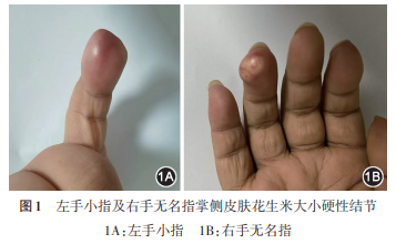 湘雅医学院附属肿瘤医院湖南省肿瘤医院病理科,长沙 410013通信作者:范洁琳, Email:fanjielin@hnca.org.cn引用本文:颜志鹏,史彩霞,陈晓艳,等. 子宫颈鳞癌治疗后手指皮肤转移1例[J]. 中华妇产科杂志,2025,60(03):225-227.DOI:10.3760/cma.j.cn112141-20240823-00470国内外关于子宫颈鳞癌手指皮肤转移的报道罕见。子宫颈癌以直接蔓延和淋巴转移为主,晚期可通过血行转移至肺、肝、骨骼等部位,皮肤转移占同期子宫颈癌患者的0.01%~2%,转移部位主要位于头面部、胸壁、下背部和外生殖器。本文报道了湖南省肿瘤医院诊治的1例子宫颈低分化鳞癌Ⅱa2期患者术后出现肺转移,治疗后又出现左手小指及右手无名指掌侧皮肤转移,确诊皮肤转移后9个月死亡。本文结合既往文献讨论子宫颈鳞癌皮肤转移的临床特点及可能机制,并强调子宫颈鳞癌手部皮肤转移的预后不良,需及时进行诊断及治疗。患者34岁,孕1产1。因“接触性出血1个月余”于2019年1月22日收入本院。患者诉1个月余前同房后出现阴道少量流血,色暗红,可自行停止,至当地医院行阴道镜下子宫颈活检术,术后病理检查提示:(子宫颈)中~低分化鳞癌。入院后妇科检查:外阴正常,阴道左侧后穹隆受侵、变浅;子宫颈直径约4 cm,布满结节状肿物,质脆,触之出血;子宫前位,正常大小,质中,双侧宫旁弹性可;双侧附件区未扪及包块。全腹增强CT检查:子宫颈软组织增厚,结合临床符合子宫颈癌,阴道上段受侵可能;余无异常。胸部CT检查未见明显异常。初步诊断:子宫颈低分化鳞癌,Ⅱa2期。于2019年1月28日行腹腔镜子宫广泛性切除+盆腔淋巴清扫术,术后病理检查提示:(1)(子宫颈)低分化鳞癌,肿物大小为4.3 cm×2.5 cm×1.2 cm,子宫颈间质浸润深度>2/3,可见脉管内癌栓;(2)盆腔淋巴结均未见癌转移;(3)阴道残端、宫体肌壁及左右宫旁组织均未见癌细胞。术后予盆腔外照射,肿瘤剂量4 600 cGy,200 cGy/次,共23次;期间予顺铂40 mg/周同步化疗,放疗结束后补充化疗(多西他赛115 mg+顺铂110 mg)2个疗程。末次治疗时间为2019年5月15日,其后定期复查。2021年3月9日因“咳嗽1个月”复查胸部CT提示双肺多发结节,行支气管镜下活检术,术后病理检查提示:(右肺中叶内侧支气管新生物)符合鳞癌,不除外转移可能。免疫组化检测:细胞角蛋白(CK)、CK5/6、p16、p40、p63、细胞程序性死亡配体1(PD-L1)阳性(+),甲状腺核转录因子1(TTF-1)、新天冬氨酸蛋白酶A(NapsinA)、间变性淋巴瘤激酶(ALK)阴性(-)。2021年3月31日至2022年8月18日行化疗+靶向治疗+免疫治疗,每3周1次控制病情。具体治疗过程如下:紫杉醇+顺铂(或卡铂)+贝伐单抗+卡瑞利单抗,共8个疗程;随后贝伐单抗+卡瑞利单抗,共8个疗程;于2022年5月复查CT提示左肺门及纵隔淋巴结较前增大,考虑疾病进展,改用紫杉醇脂质体+卡铂+贝伐单抗+卡瑞利单抗,共3个疗程。2022年10月出现骨髓抑制Ⅳ度,血小板最低至2×10 9/L,伴间歇性左侧鼻腔出血。骨髓穿刺提示:巨核细胞成熟障碍,未见癌巢,骨髓形态基本正常。血液内科会诊考虑:全血细胞减少,免疫相关性可能性大。予对症支持治疗。患者于2022年12月自觉左手小指及右手无名指掌侧皮肤( 图1 )、右侧前胸和后背肋下皮肤可触及花生米大小硬性结节,有压痛,移动度差。给予活检后病理检查提示:(1)(右手无名指结节)中分化鳞癌;(2)(左手小指结节)高~中分化鳞癌。见 图2 。结合临床病史考虑:子宫颈鳞癌手指皮肤转移。因病情较晚、骨髓抑制及社会因素,患者拒绝治疗要求出院,后电话随访患者于2023年9月在家中去世。子宫颈癌以直接蔓延和淋巴转移为主,晚期可通过血行转移至肺、肝、骨骼等部位,皮肤转移罕见,占同期子宫颈癌的0.01%~2% [ 1 , 2 ] 。Shen等 [ 3 ] 统计了8 171例子宫颈癌患者中有6例皮肤转移,发生率为0.07%,转移部位主要位于头面部、胸壁、下背部和外生殖器。Dai等 [ 4 ] 报道了1例33岁子宫颈鳞癌Ⅳb期患者接受了6个疗程的免疫治疗和化疗,并对转移性残留灶和子宫颈原发肿瘤进行放疗后,患者的头皮和躯干出现了多个结节,包括左侧腋窝、腹部和左侧背部,穿刺后病理检查证实为转移性鳞癌。Takagi等 [ 5 ] 报道了1例子宫颈癌Ⅱb期患者术后行同步放化疗后8个月,随访期间出现头皮转移,该患者在明确诊断皮肤转移后仅接受了局部放疗,并在治疗后数月内死亡。1. 临床特点:子宫颈鳞癌皮肤转移的临床表现多种多样。文献报道的皮肤病变包